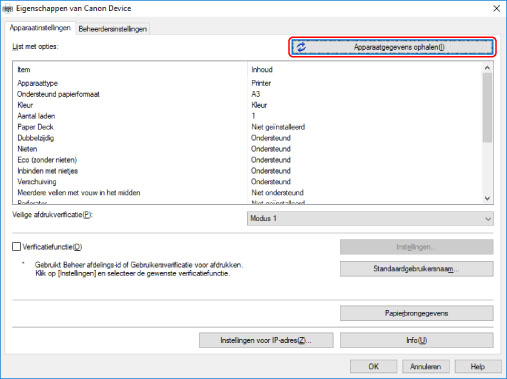 Bij installatie van een stuurprogramma via een netwerkverbinding wordt de informatie over de geïnstalleerde opties in het apparaat normaal opgehaald en worden de functies die aan het stuurprogramma zijn gekoppeld ingesteld zodat deze kunnen worden gebruikt. Wanneer de functies van het apparaat niet kunnen worden gebruikt of wanneer een optie wordt toegevoegd, moet de apparaatinformatie opnieuw worden opgehaald en moet de optiestructuur handmatig worden ingesteld.
