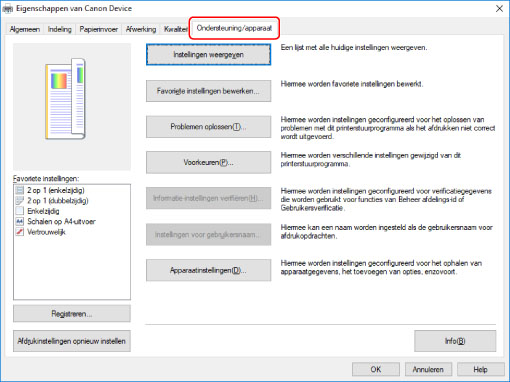 OPMERKINGAls het standaardscherm met afdrukinstellingen van Windows zonder het tabblad [Ondersteuning/apparaat] wordt weergegeven, is er mogelijk een probleem met de omgeving, instellingen of installatie van het stuurprogramma. Raadpleeg de bijbehorende probleemoplossingen om het scherm met de afdrukinstellingen van het stuurprogramma weer te geven.