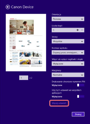 Jeżeli żądane funkcje nie są widoczne na ekranie ustawień drukowania wyświetlanym w aplikacji ze Sklepu, ich użycie będzie możliwe po zmianie ustawień domyślnych.