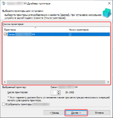Выберите устройство, которое требуется установить, в списке [Список принтеров] → нажмите [Далее].