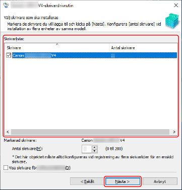 Välj enhet att installera från [Skrivarlista] → klicka på [Nästa].