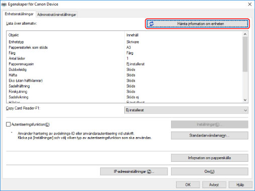 När du installerar en drivrutin med en nätverksanslutning, hämtas vanligen information om de tillval som är installerade i enheten och funktionen associerade med drivrutinen ställs in så att de kan användas. När funktionerna i enheten inte kan användas, eller när ett tillval läggs till, måste enhetsinformationen hämtas på nytt och tillvalsstrukturen ställas in manuellt.