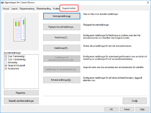 OBS!Om standardskärmen med utskriftsinställningar i Windows, som inte har fliken [Support/enhet], visas kan det bero på problem med miljön, inställningarna eller drivrutinens installationsstatus. Se följande felsökning och åtgärder för att kunna visa drivrutinens utskriftsinställningsskärm.