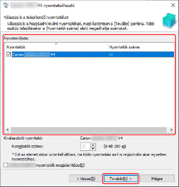 Válassza ki a telepítendő eszközt a [Nyomtatólista] listából → kattintson a [Tovább] gombra.