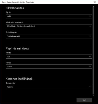 Amennyiben a környezet nem teszi lehetővé az illesztőprogram illesztővel történő telepítését, akkor a Windows szokásos Nyomtatási beállítások képernyőjét használhatja.