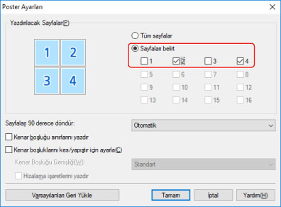 [Poster Ayarları] iletişim kutusu > [Sayfaları 90 derece döndür] > [Açık] veya [Otomatik] seçiliyken