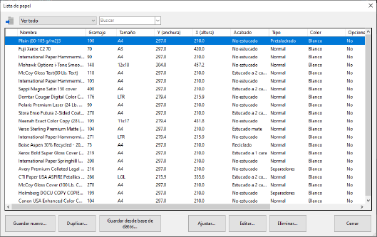 Se muestra haciendo clic en [Guardar desde base de datos] en la ventana Lista de papel. Copie cualquier tipo de papel desde la base de datos de papel en la lista de papel añadido o en la lista de papel tipo estándar que se ha guardado en su impresora. También puede guardar opciones y guardar tipos de papel como tipos personalizados para utilizar en la impresora.