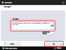 Stiskněte pole pro zadávání textu [User Agent] → zadejte požadované nastavení [User Agent] → stiskněte [OK].