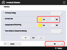Valitse [Security] → valitse [On] kohdassa [Use JavaScript] → [OK].