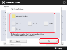 TLS-versioiden ylä- ja alarajat voi määrittää laitteessa asetuksella [Määritä sallitut versiot] kohdassa [TLS-asetukset]. Tietoja laitteen TLS-version vaihtamisesta on oppaassa "Käyttöopas".