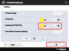 Naciśnij przycisk [Security] → wybierz opcję [On] dla [Display Mixed HTTPS/HTTP Pg] → naciśnij przycisk [OK].