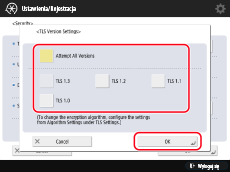 Górny i dolny limit wersji TLS można ustawić w opcji [Określ dozwolone wersje] w [Ustawienia TLS] na urządzeniu. Aby uzyskać informacje dotyczące zmiany wersji TLS urządzenia, patrz „Podręcznik użytkownika”.