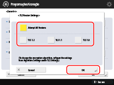 Os limites inferiores das versões de TLS podem ser programados em [Especif. versões permit.] em [Programações TLS] na máquina. Para obter informações sobre como alterar a versão de TLS da máquina, consulte o "Manual do utilizador".