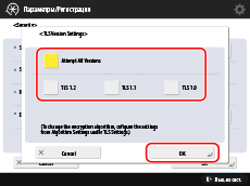 Верхний и нижний лимит версий TLS можно установить в [Указать разреш. версии] в [Параметры TLS] в аппарате. Сведения об изменении версии TLS аппарата см. в документе «Руководство пользователя».