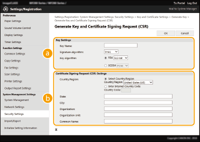 Because certificates generated on the machine do not have a CA signature, a communication error may result depending on devices it communicates with. To have the certificate authority issue the certificate with the CA signature, you need to obtain data of CSR (Certificate Signing Request), which the administrator can generate from Remote UI. When the certificate is issued, register it in the key with the CSR generated.