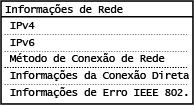 Exibe as definições de rede como, por exemplo, o endereço IP da máquina, e status como, por exemplo, as condições das comunicações LAN sem fio.