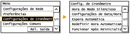 Você pode alterar uma variedade de configurações relacionadas à tela, como a velocidade de rolagem ou o idioma: <Configurações de Exibição> Para alterar a tela automaticamente exibida quando a máquina permanece ociosa por um tempo especificado: <Funcionar Após Reinicialização Auto> Você pode alterar várias definições sobre a operacionalidade tais com o brilho da tela. <Configurações de Exibição> |