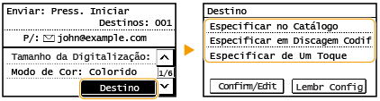 Se um destino for selecionado a partir de <End. Catál.> na tela Início, as configurações para envio de email ou gravação de arquivo podem ser feitas enquanto o destino selecionado permanece especificado. |