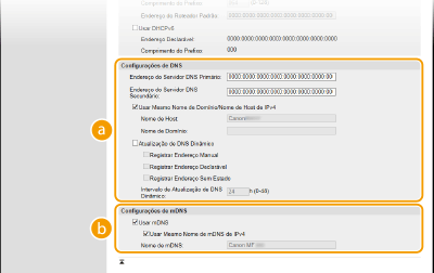 2 | Configure as definições de DNS do IPv4. ![]() [Configurações de DNS][Endereço do Servidor DNS Primário] Digite o endereço IP de um servidor DNS. [Endereço do Servidor DNS Secundário] Digite o endereço IP de um servidor DNS, se houver algum. [Nome de Host] Digite os caracteres alfanuméricos para o nome do host da máquina que será registrada no servidor DNS. [Nome de Domínio] Digite os caracteres alfanuméricos para o nome do domínio pertencente à máquina, como "example.com". [Atualização de DNS Dinâmico] Marque a caixa de seleção para atualizar dinamicamente os registros de DNS se o endereço IP da máquina for alterado. Ao especificar o intervalo entre as atualizações, insira o tempo em horas na caixa de texto [Intervalo de Atualização de DNS Dinâmico]. [Configurações de mDNS][Usar mDNS] Adotado pelo Bonjour, o mDNS (DNS multicast) é um protocolo para associar um nome de host com um endereço IP sem usar o DNS. Marque a caixa de seleção para ativar o mDNS e digite o nome mDNS na caixa de texto [Nome de mDNS]. [Configurações de Opção DHCP][Adquirir Nome de Host] Marque a caixa de seleção para ativar a Opção 12 para obter o nome de host do servidor DHCP. [Atualização de DNS Dinâmico] Marque a caixa de seleção para ativar a Opção 81 para atualizar dinamicamente os registros DNS através do servidor DHCP. [Adquirir Endereço do Servidor SMTP] Marque a caixa de seleção para ativar a Opção 69 para obter um endereço de servidor SMTP do servidor DHCP. [Adquirir Endereço do Servidor POP] Marque a caixa de seleção para ativar a Opção 70 para obter um endereço de servidor POP3 do servidor DHCP. |