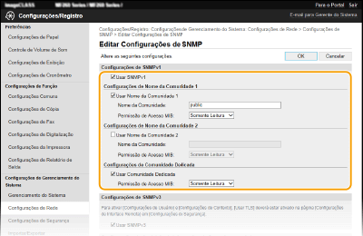 Como desativar SNMPv1Se SNMPv1 for desativada, algumas das funções da máquina ficam indisponíveis, como obter a informação da máquina através do driver de impressora. Usando o painel de operaçõesVocê pode também definir as configurações de SNMPv1 e habilitar/desabilitar as configurações de SNMPv3 a partir da tela <Menu>. <Configurações de SNMP> |