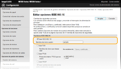 Marque la casilla de verificación [Usar IEEE 802.1X] e introduzca el nombre de inicio de sesión en el cuadro de texto [Nombre de inicio sesión].