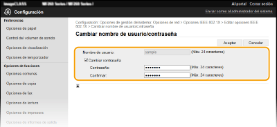 3 | Establezca nombre de usuario/la contraseña. [Nombre de usuario] Introduzca caracteres alfanuméricos en el nombre de usuario. [Cambiar contraseña] Para configurar o cambiar la contraseña, seleccione la casilla de verificación e introduzca caracteres alfanuméricos para la nueva contraseña en los cuadros de texto [Contraseña] y [Confirmar]. |