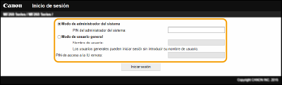 Seleccione [Modo de administrador del sistema] o [Modo de usuario general] y, a continuación, introduzca el PIN apropiado en [PIN de acceso a la IU remota] según sea necesario.