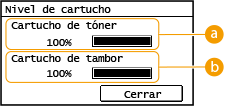 La cantidad restante en el cartucho de tóner o en el cartucho de tambor mostrada únicamente deberá utilizarse como guía y podría diferir de la cantidad real. Otros componentes internos podrían llegar al final de su vida útil antes de que la cantidad restante en el cartucho de tóner o en el cartucho de tambor se agote. |
