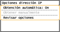 3 | Compruebe que <IP automática> esté establecido en <On>. Si está seleccionado <Off>, cambie la opción a <On>. |