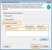 3 | Seleccione [Detección automática] y seleccione el equipo cuando se detecte y haga clic en [Siguiente]. ![]() ![]() Si el equipo no se detecta Haga clic en [Actualizar]. Si el problema persiste, seleccione [Dirección IP] o [Dirección MAC], introduzca la dirección IP o la dirección MAC del equipo (Visualización de las opciones de red) y, a continuación, haga clic en [Siguiente]. |