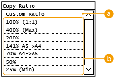 You can enlarge or reduce copies by using a preset copy ratio such as <141% A5->A4>, or by setting a custom copy ratio in increments of 1 %.