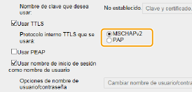Seleccione la casilla de verificación [Usar TTLS] o [Usar PEAP].