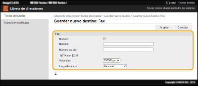 <Opciones de fax>) en el panel de control. No obstante, los ajustes realizados desde <Lib. dir.> se habilitarán para las opciones detalladas de destinos registrados en la libreta de direcciones.