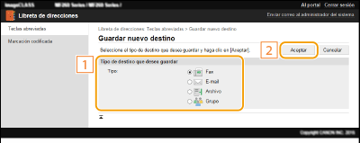 Seleccione [Tipo de destino que desea guardar] y haga clic en [Aceptar].