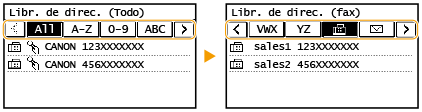 Puede registrar los destinos de fax/escaneo que utilice con mayor frecuencia en la libreta de direcciones y seleccionarlos fácilmente cuando sea necesario (Registro de destinos en la libreta de direcciones). Puede buscar destinos por orden alfabético, en listas de la libreta de direcciones o introduciendo números de tres dígitos (números de marcación codificada). Asimismo, puede especificar destinos de una forma más rápida utilizando las funciones siguientes.