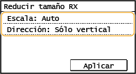 Especifique las opciones para reducir el tamaño de imagen de un documento recibido. Puede seleccionar una escala de reducción automática que reduzca el documento recibido al tamaño del papel cargado. Asimismo, puede seleccionar una escala de la lista.