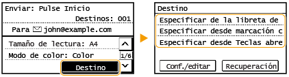 Si se selecciona un destino de la <Lib. dir.> en la pantalla Inicio, podrá configurar las opciones para el envío de e-mail mientras permanece especificado el destino seleccionado.