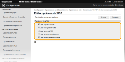 Seleccione la casilla de verificación para obtener información sobre el equipo desde un ordenador a través de WSD. Esta casilla de verificación se selecciona automáticamente cuando se marca la casilla de verificación [Usar impresión WSD]. [Usar lectura WSD]