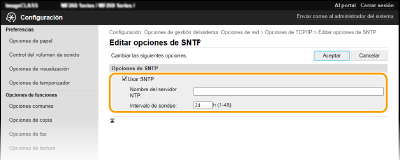 Seleccione la casilla de verificación [Usar SNTP] y especifique las opciones necesarias.