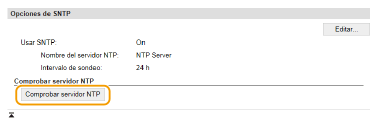 Podrá visualizar el estado de comunicación con el servidor registrado haciendo clic en [Configuración]  [Opciones de red]  [Opciones de TCP/IP]  [Comprobar servidor NTP] en [Opciones de SNTP]. Si se ha establecido correctamente una conexión, el resultado se mostrará como se indica abajo. Tenga en cuenta que esta operación no ajusta el reloj del sistema.