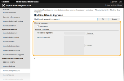 Se gli indirizzi MAC sono immessi in modo non corretto, potrebbe diventare impossibile accedere alla macchina dalla IU remota, in questo caso è necessario impostare <Filtro indirizzi MAC> su <Off>. <Filtro indirizzi MAC>