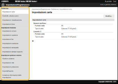 È possibile modificare le varie impostazioni della macchina tramite la IU remota. È inoltre possibile configurare la maggior parte delle impostazioni sulla macchina, ma per alcune è possibile utilizzare solo la IU remota. In questa sezione viene descritto il flusso di lavoro base per modificare le impostazioni della macchina usando la IU remota.