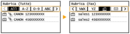 È possibile registrare le destinazioni fax/scansione più utilizzate nella Rubrica e selezionarle con facilità quando serve (Registrazione delle destinazioni nella Rubrica). La ricerca delle destinazioni può essere eseguita in ordine alfabetico, dagli elenchi nella Rubrica o immettendo numeri a tre cifre (numeri a selezione codificata). È inoltre possibile specificare le destinazioni in modo più rapido tramite le funzioni seguenti.