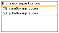 È possibile selezionare una destinazione tra quelle già utilizzate. Quando si specifica una destinazione utilizzata in precedenza, la macchina imposta anche gli stessi parametri di scansione, come la densità, utilizzati per l'ultimo invio di documenti a tale destinazione.