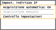 Selezionare <Acquisizione automatica> e impostare sia <Selezione protocollo> che <IP automatico> su <Off>.