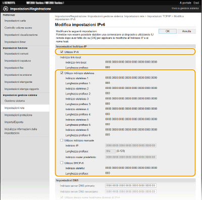 Gli indirizzi IPv6 della macchina possono essere configurati attraverso la IU remota. Prima di impostare indirizzi IPv6, verificare le impostazioni dell'indirizzo IPv4 (Visualizzazione delle impostazioni IPv4). È necessario impostare correttamente i parametri IPv4 per utilizzare gli indirizzi IPv6. Tenere presente che la funzione di scansione che utilizza il driver dello scanner o MF Scan Utility non è disponibile in ambiente IPv6. La macchina può utilizzare i seguenti indirizzi IPv6: