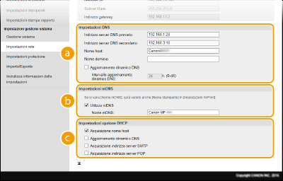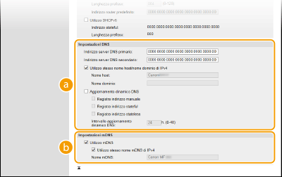 Selezionare la casella di controllo per aggiornare dinamicamente i record DNS qualora cambi l'indirizzo IP della macchina. Quando si specifica l'intervallo tra gli aggiornamenti, specificare il tempo in ore nella casella di testo [Intervallo aggiornamento dinamico DNS]. [Impostazioni mDNS][Utilizzo mDNS]