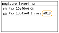 Se la stampa non riesce o non è possibile inviare o ricevere fax o documenti acquisiti oppure si verifica un altro errore, tale errore viene segnalato su un rapporto o con un messaggio sulla schermata <Monitoraggio stato> come numero di tre cifre (codice di errore). Verificare quanto segue per individuare cause e soluzioni per ciascun codice di errore. Per istruzioni su come stampare un rapporto di errore e sulle informazioni contenute nel rapporto, vedere