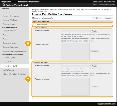 En cas de saisie incorrecte des adresses IP, vous risquez de ne pas pouvoir accéder à l'appareil via l'IU distante. Si cela devait se produire, il faudrait définir <Filtre d'adresse IPv4> ou <Filtre d'adresse IPv6> sur <Désactivé>. <Filtre d'adresse IPv4><Filtre d'adresse IPv6>