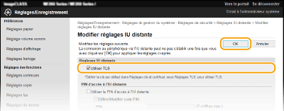 Utilisation du panneau de commandeVous pouvez également activer ou désactiver le cryptage TLS à partir de l'écran <Menu>. <Utiliser TLS>